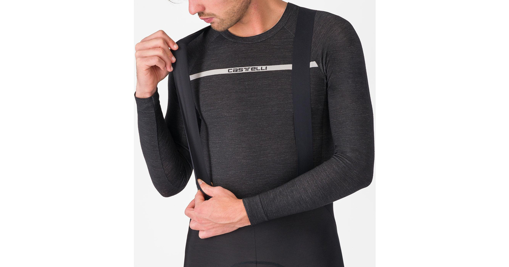 - Das Core Due Gewebe von Castelli an der Vorderseite (bis zu den Knien) mit seiner eng gewebten Außenseite aus Nylon und einer hohlen Polyester-Fleece-Innenseite blockiert mehr Wind und sorgt gleichzeitig für hervorragende Isolation und Feuchtigkeitsmanagement
