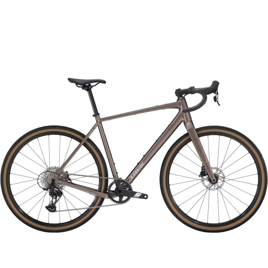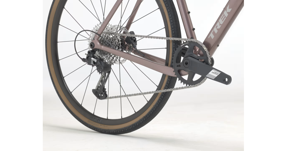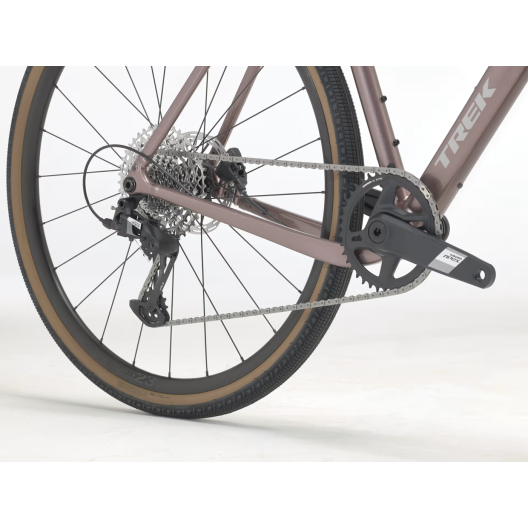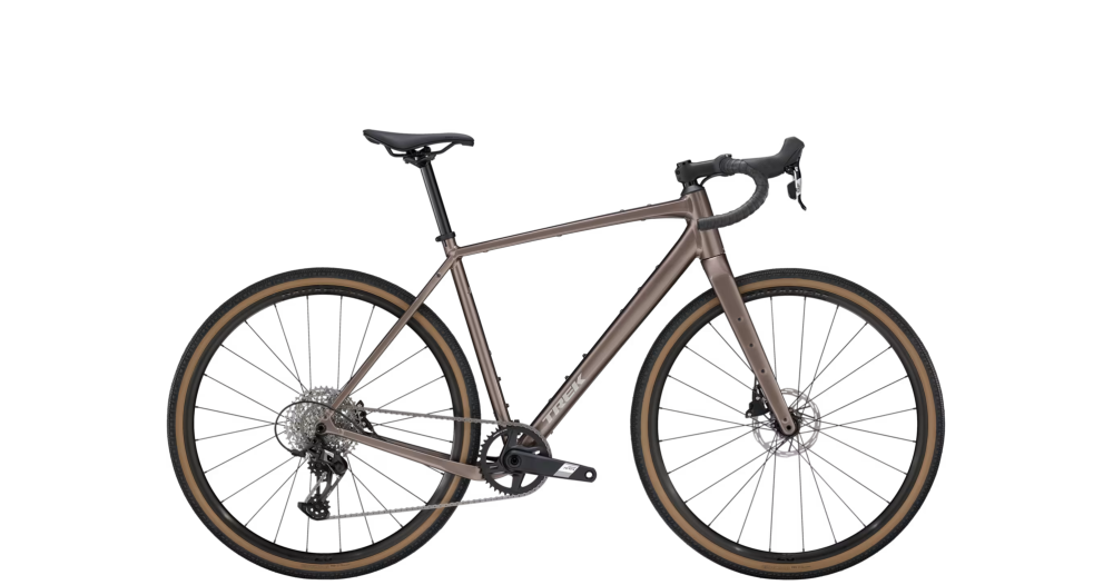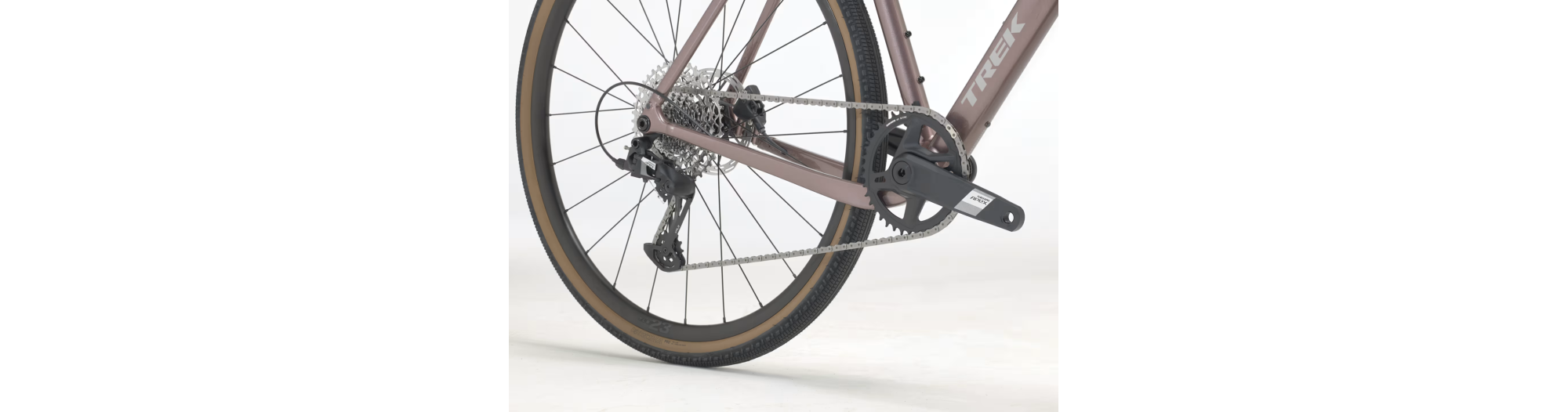 Alpha Aluminiumrahmen der Serie 300 mit Carbongabel und einer Reifenfreiheit von maximal 50 mm. Verbesserte SRAM Apex XPLR 12-Gang-Schaltung, hydraulische Scheibenbremsen, Bontrager Paradigm Räder mit Bontrager Girona Pro Tubeless-Ready-Reifen und mehrere Befestigungsmöglichkeiten für Taschen, Gepäckträger und anderes Zubehör.