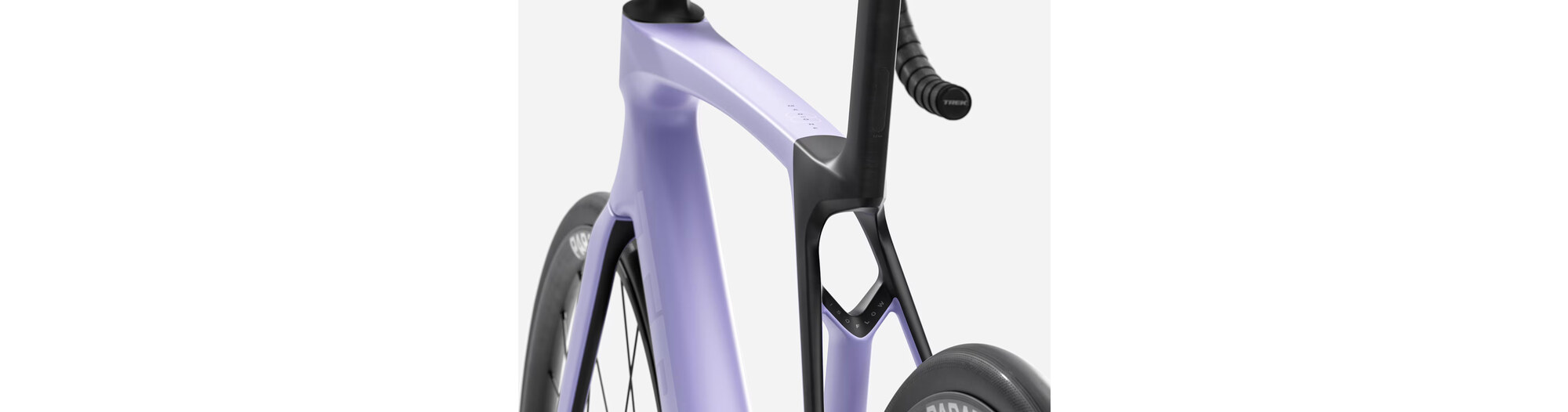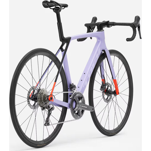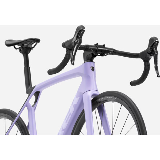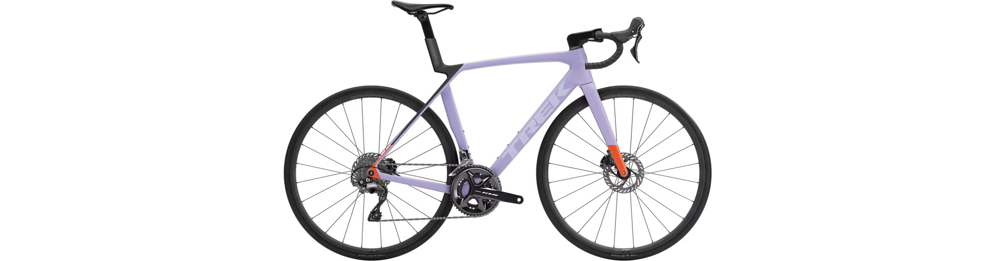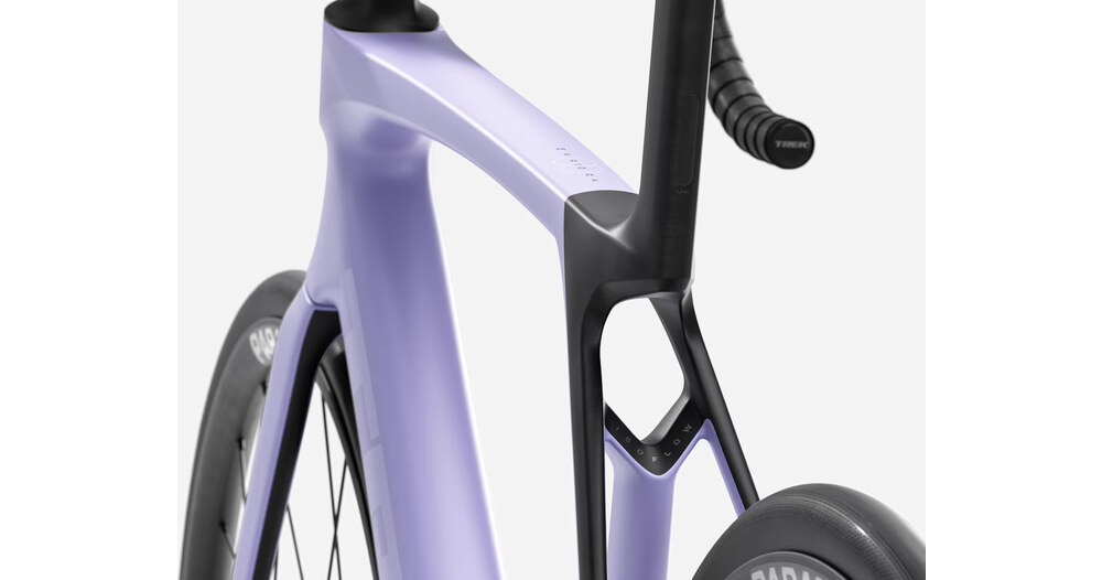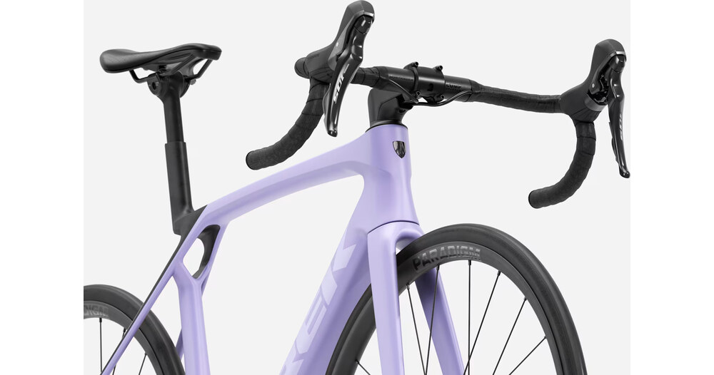 - Madone 8e gén. voll aus Carbon, konisches Steuerrohr aus Carbon, interne Kabelführung für Bremsen, Flat-Mount-Scheibenbremsen, geriffelte Steckachsen von 12x100 mm