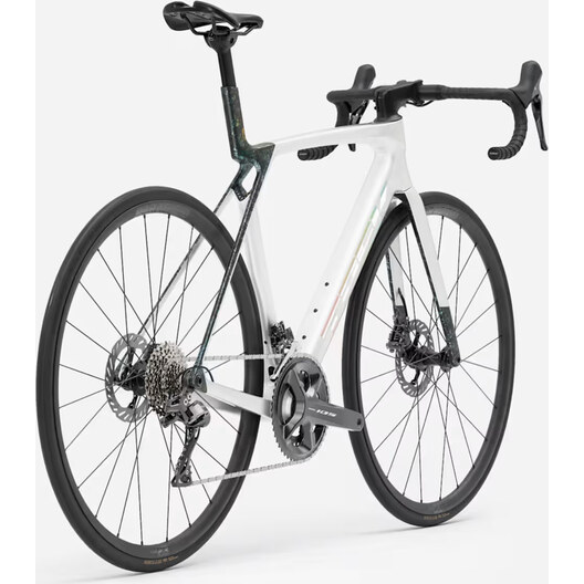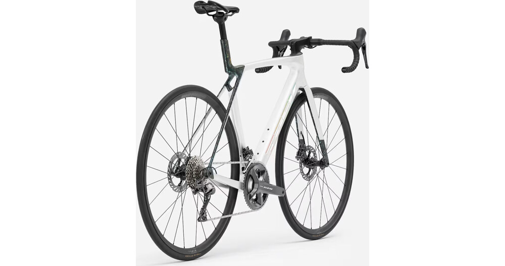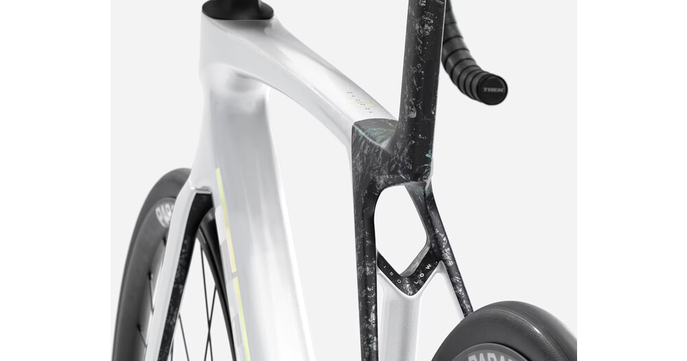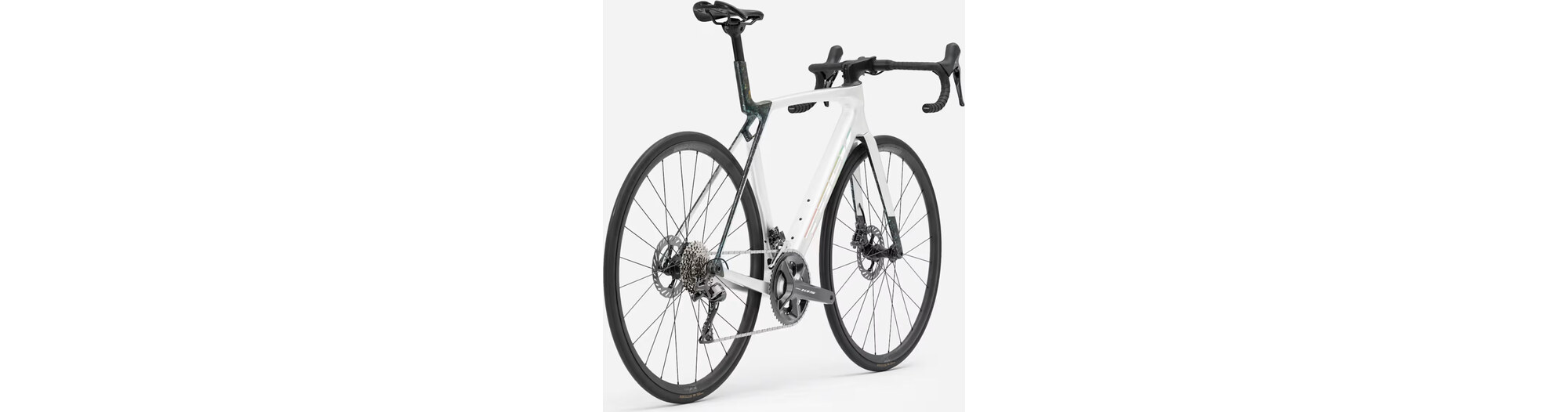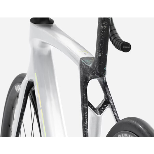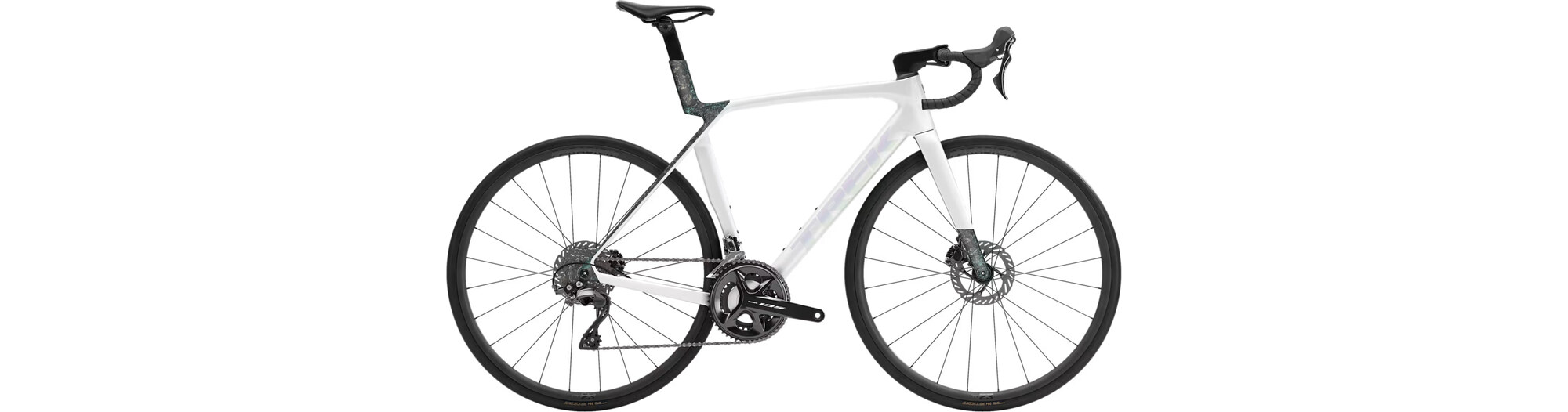 - Madone 8e gén. voll aus Carbon, konisches Steuerrohr aus Carbon, interne Kabelführung für Bremsen, Flat-Mount-Scheibenbremsen, geriffelte Steckachsen von 12x100 mm