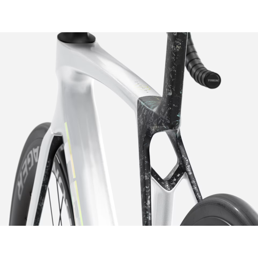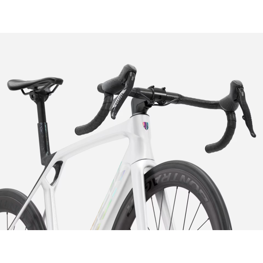 - Madone 8e gén. komplett aus Carbon, konisches Carbon-Steuerrohr, interne Verlegung der Bremskabel, Flat-Mount Scheibenbremsen, gerillte 12x100 mm Steckachsen