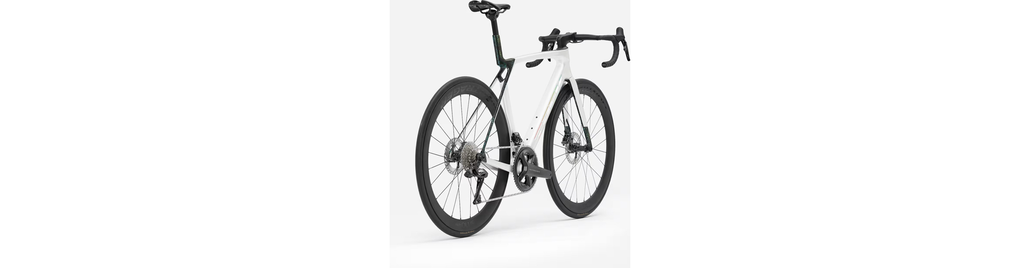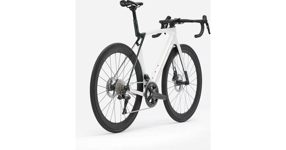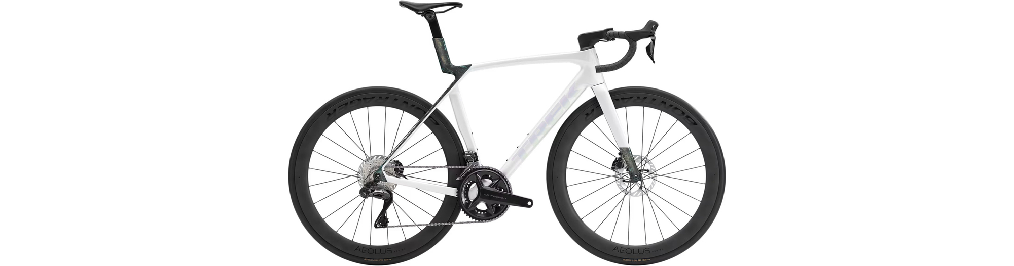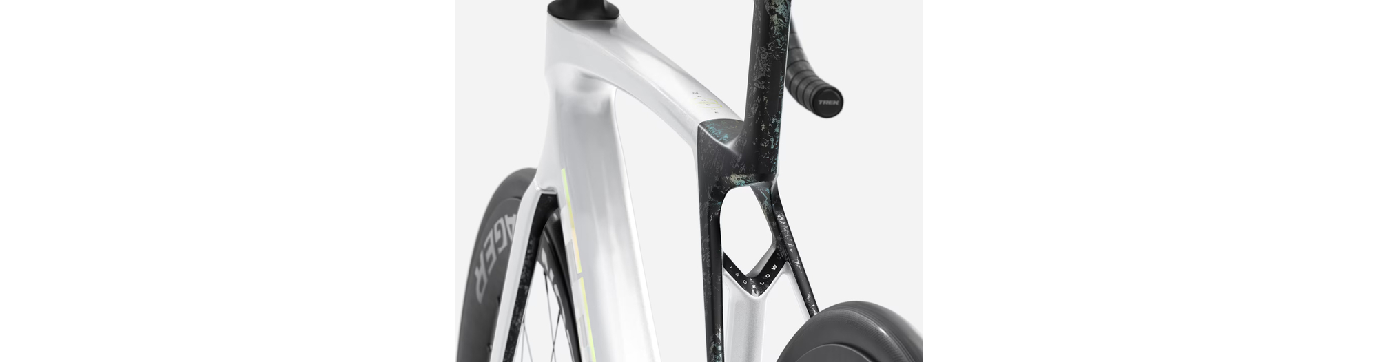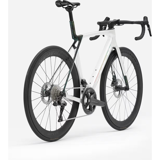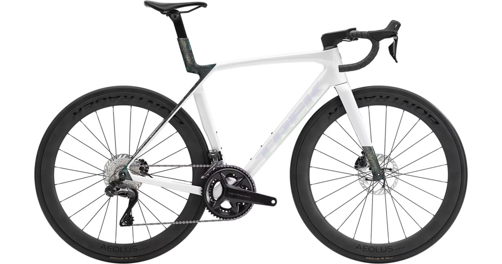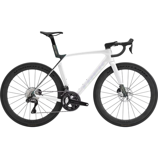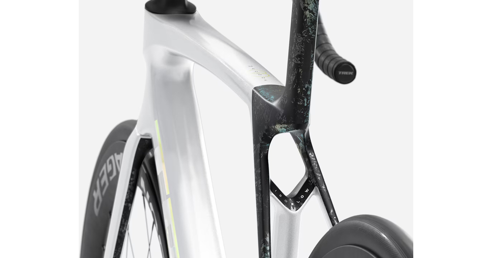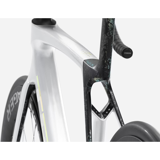 - Madone 8e Gen. komplett aus Carbon, konisches Steuerrohr aus Carbon, interne Kabelführung der Bremsen, Flat-Mount-Scheibenbremsen, 12x100 mm Steckachsen mit Verzahnung
