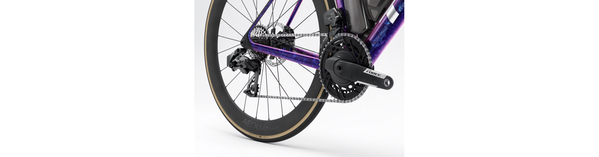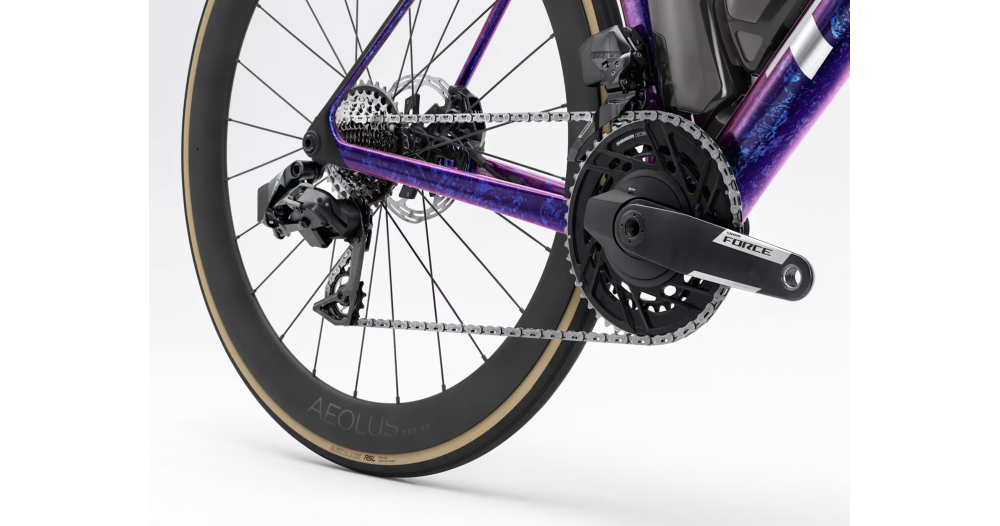 - OCLV Carbon Serie 900, Full System Foil Rohrform, IsoFlow Sattelstütze, RCS Steuersatz, nur elektronische Verkabelung, abnehmbarer aerodynamischer Kettenschutz, T47 Tretlagergehäuse, Flat Mount Scheibenbremsen, universelle Schaltaugen (UDH), 142x12 mm Steckachse
