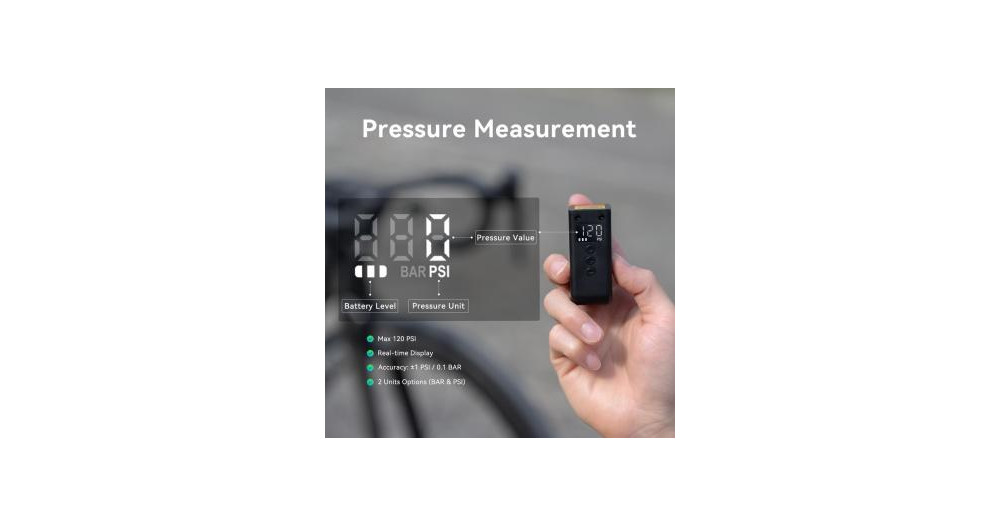 - Genauigkeit der Luftdruckanzeige: ± 1 PSI (0,068 bar)