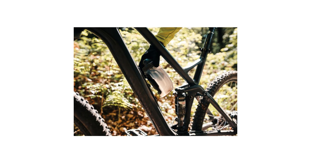 Trinkflasche inklusive Bike Base, die auf die Gewindeeinsätze des Rahmens geschraubt wird