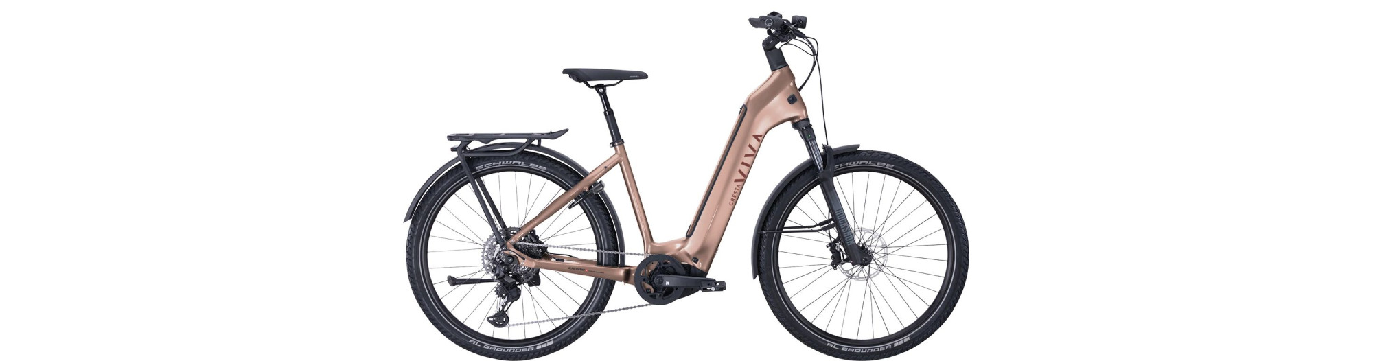 Der Cresta eViva GT begeistert durch seinen extrem leisen Betrieb und seinen hohen Komfort. Das aus einem Stück geformte Unterrohr verleiht dem Tiefeinsteigerrahmen maximale Steifigkeit. Selbst bei hoher Geschwindigkeit vibriert der Rahmen nicht und bleibt sicher auf der Straße. Mit seinen 27,5"-Rädern fährt das Elektrofahrrad agil, ohne dabei nervös zu wirken. Breite Reifen, gefederte Gabel und Sattelstütze tragen zu einem hohen Komfort und einer entspannten Fahrt bei. Der verstellbare Vorbau ermöglicht es, den Lenker genau auf die gewünschte Position einzustellen. Es ist auch möglich, von einer aufrechten Haltung zu einer leicht geneigten Haltung zu wechseln.