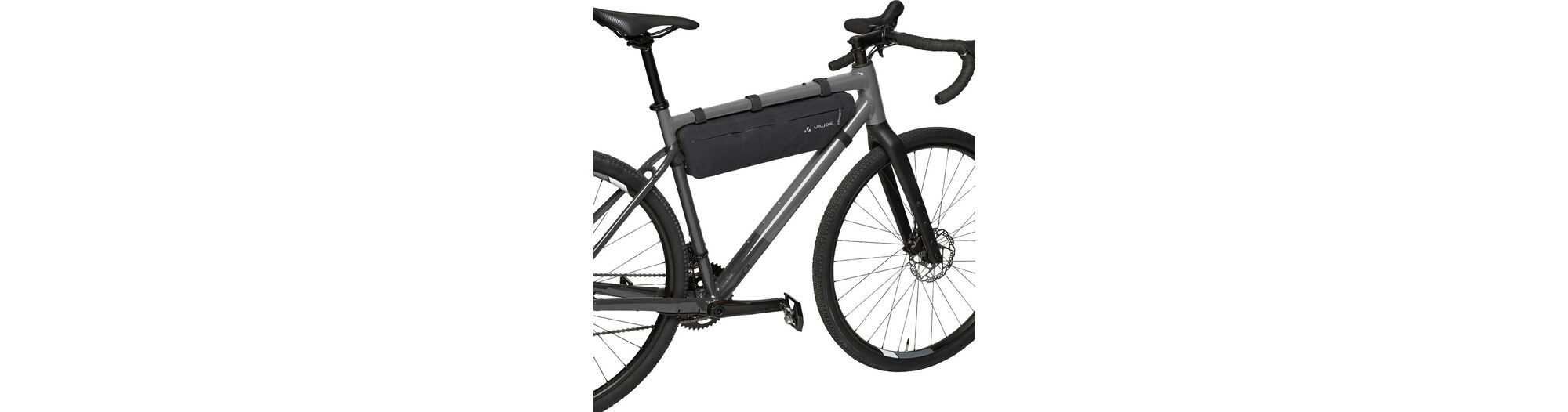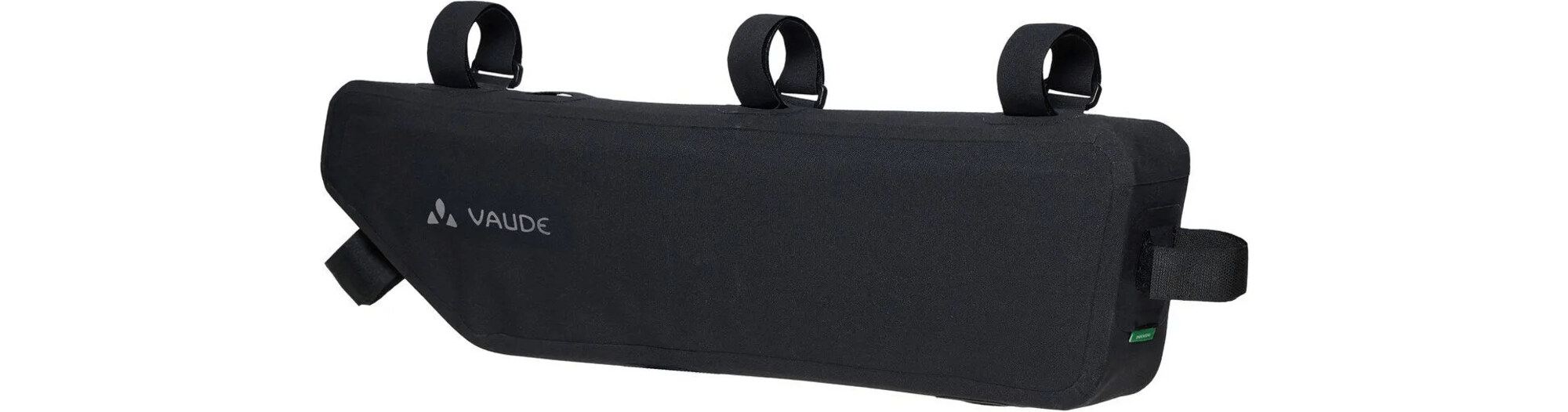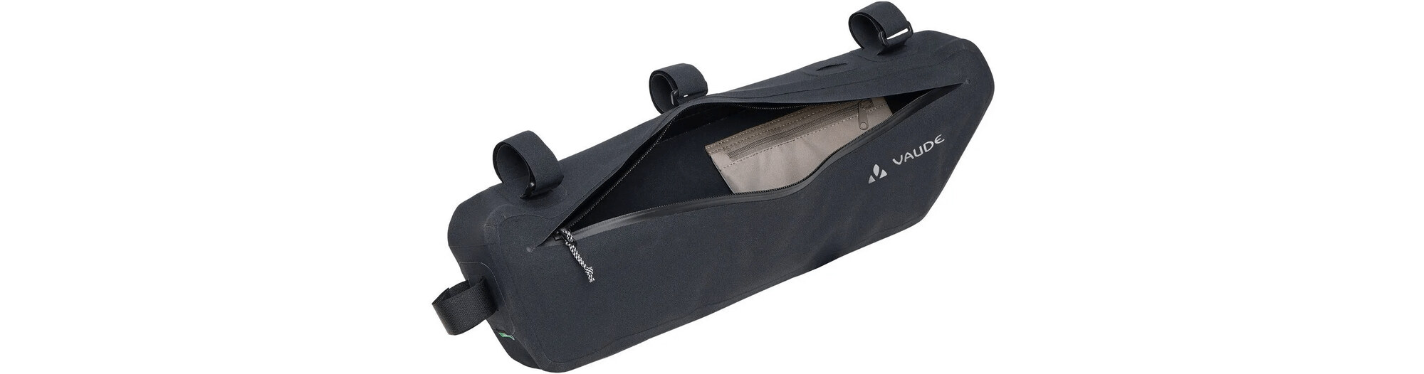 Die thermosverschweißte, wasserdichte Tasche wird mit stabilen Klettbändern am Steuerrohr, Oberrohr und Sitzrohr befestigt. Das schlanke Design bietet ausreichend Kniefreiheit, während ein inneres Klettband den Inhalt sichert und ein Aufblähen der Tasche verhindert.