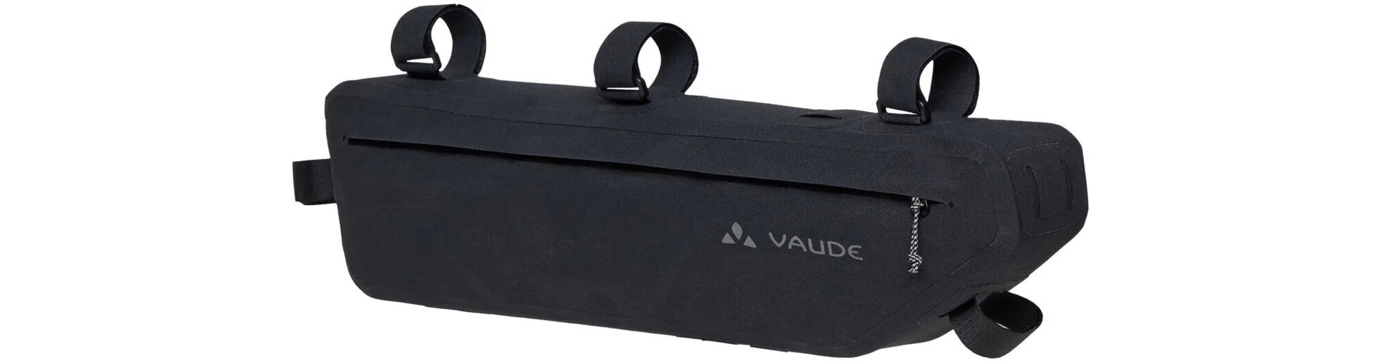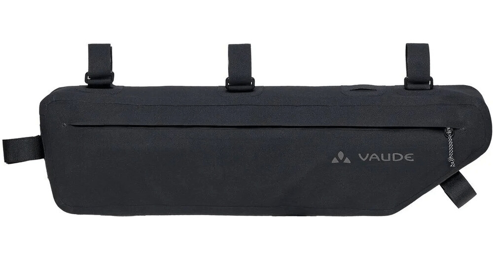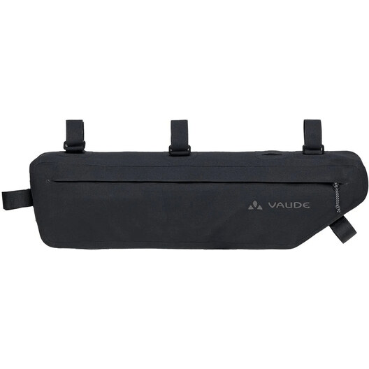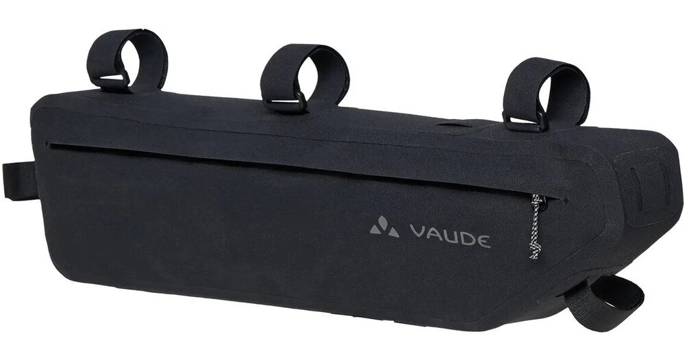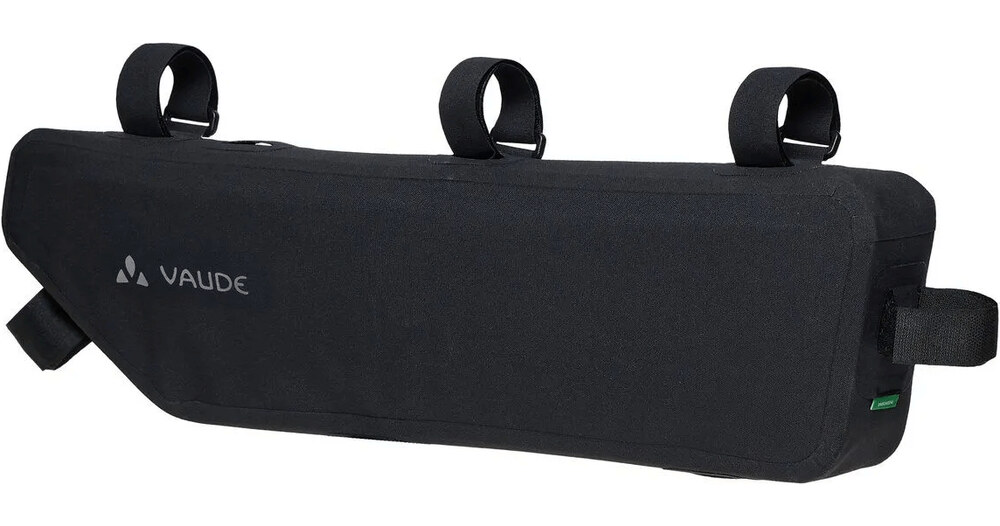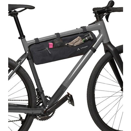 Die thermosverschweißte, wasserdichte Tasche wird mit stabilen Klettbändern am Steuerrohr, Oberrohr und Sitzrohr befestigt. Das schlanke Design bietet ausreichend Kniefreiheit, während ein inneres Klettband den Inhalt sichert und ein Aufblähen der Tasche verhindert.