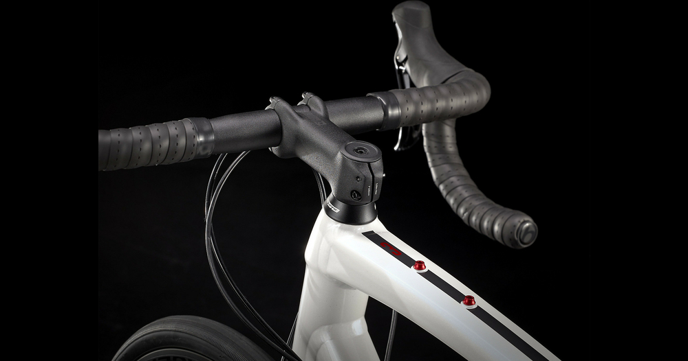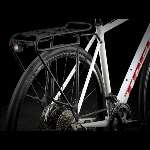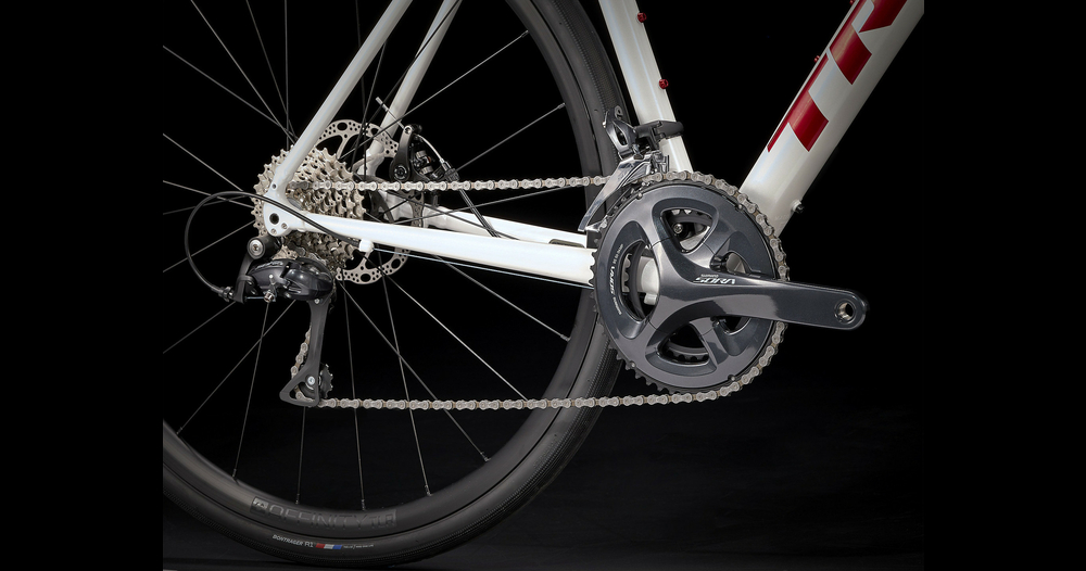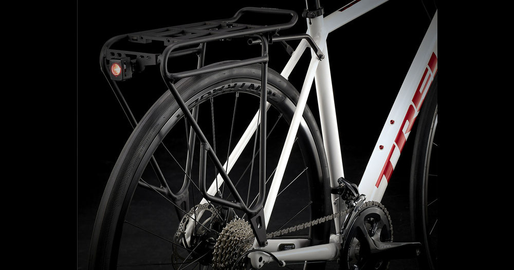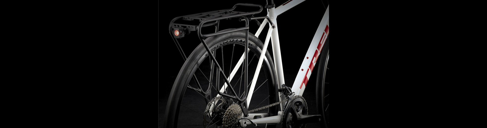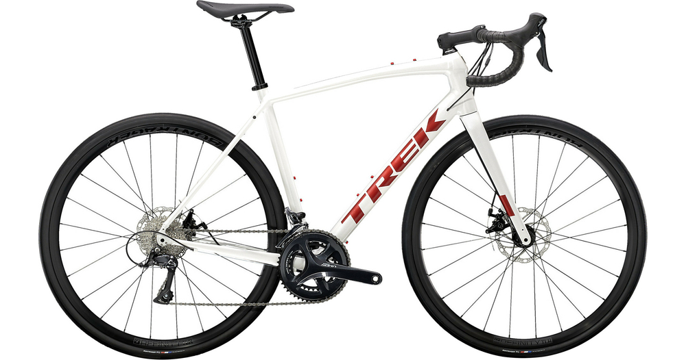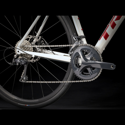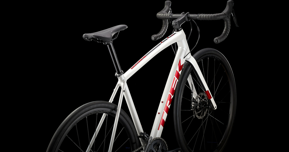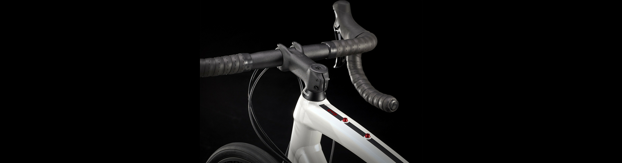 - Domane AL carbone, pivot conique alliage alu, acheminement interne des câbles de frein, fixations pour garde-boue, freins à disque à fixation Flat-Mount, axe traversant 12x100 mm