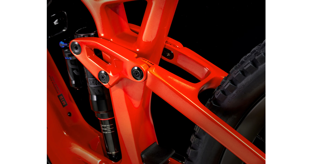 - OCLV Mountain Carbon, batterie amovible, acheminement interne des câbles, basculeur en alliage, tube de selle de 34,9 mm, fixation supérieure de guide-chaîne, ligne de chaîne de 55 mm, Mino Link, ABP, Boost148, UDH, débattement de 140 mm