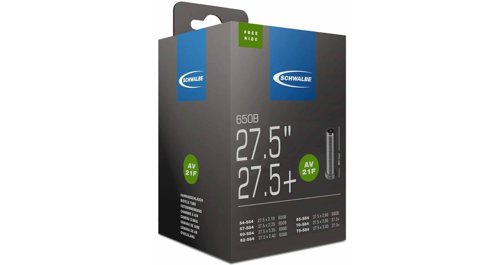 La chambre à air Schwalbe No. 21F est compatible avec les pneus 27,5" et 27,5+" de largeur comprise entre 54 et 75 mm et est destinée aux VTT.