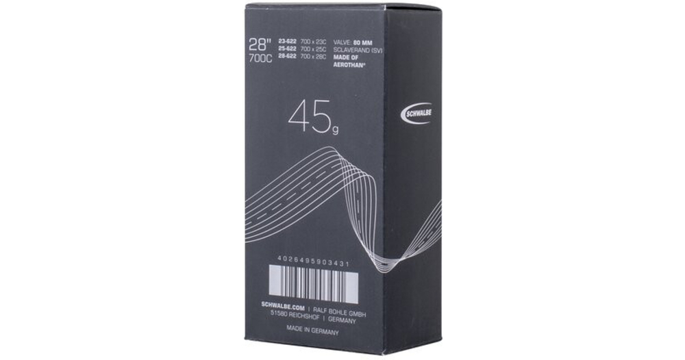 La chambre à air Schwalbe Aerothan Race est extrêmement légère avec une grande résistance aux crevaisons et une faible résistance au roulement pour une utilisation intensive. Elle conserve sa forme même en cas de faible pression. Les chambre à air Aerothan sont composés à 100% de polyuréthane thermoplastique (TPU) hors valve et sont entièrement recyclables.