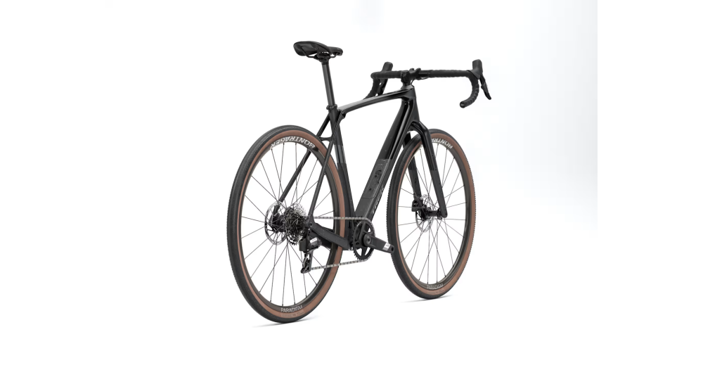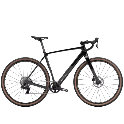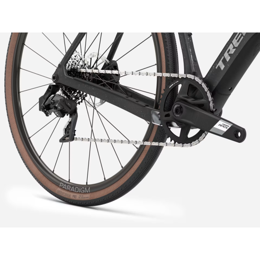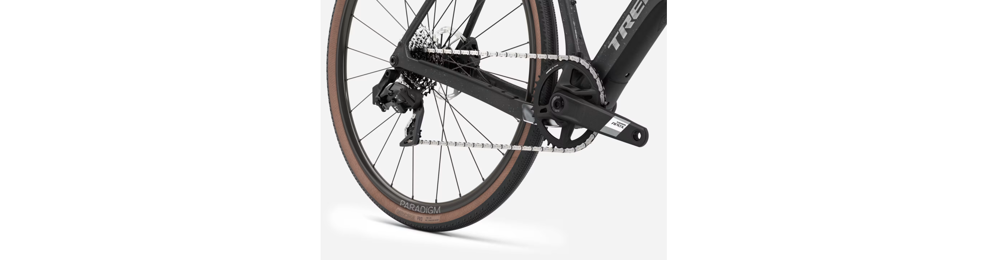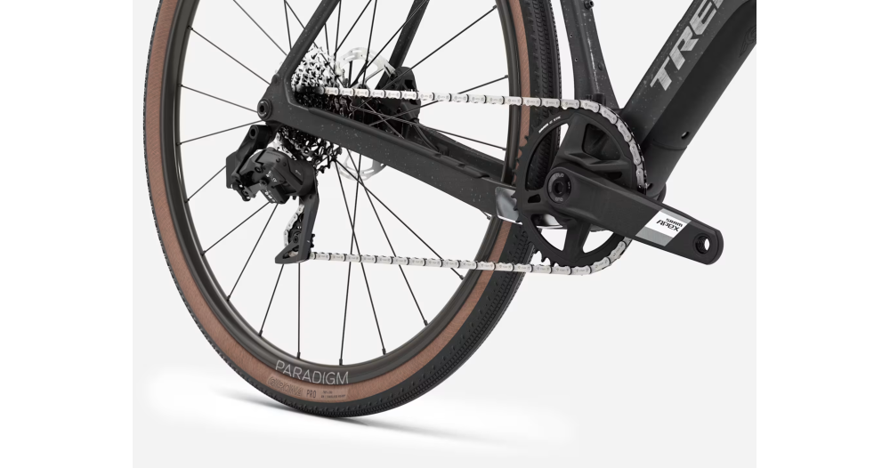 Un cadre en carbone OCLV série 500 avec fourche en carbone, rangement interne sur le tube diagonal, des fixations sur cadre et fourche et un dégagement pour des pneus de 50 mm (tel que mesuré). Une transmission 12 vitesses monoplateau Apex ZPLR AXS de SRAM entièrement sans fil, des freins à disque hydrauliques, une tige de selle en carbone et des roues Tubeless Ready Paradigm SL de Bontrager avec des pneus de 42 mm.