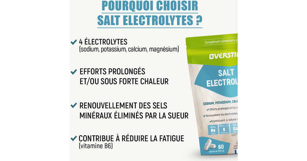 Salt & électrolytes sont des gélules d'électrolytes pour compenser les pertes en sels minéraux pendant les efforts prolongés et/ou sous forte chaleur. Sa formule spécifique contient 4 électrolytes (sodium, potassium, calcium, magnésium) et de la vitamine B6.