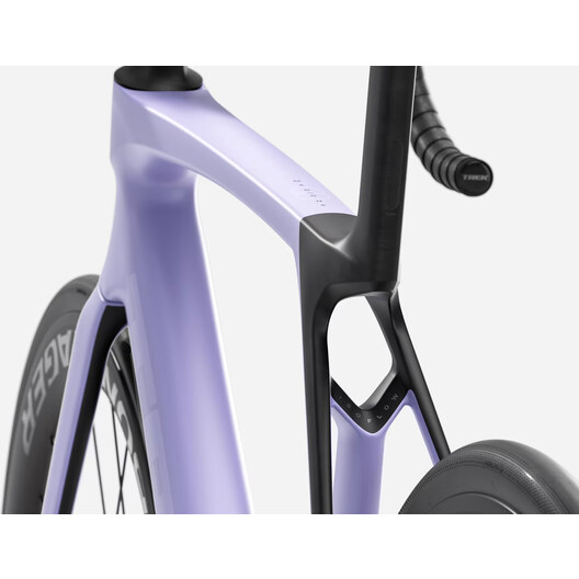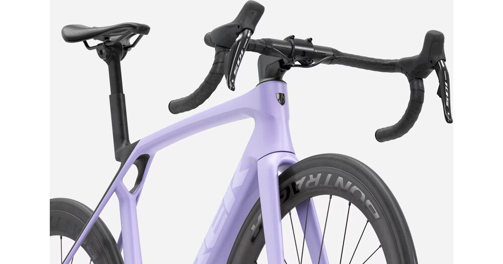 - Madone 8e gén. tout en carbone, douille de direction conique carbone, acheminement interne des câbles de frein, freins à disque à fixation Flat-Mount, axes traversants cannelés de 12x100 mm