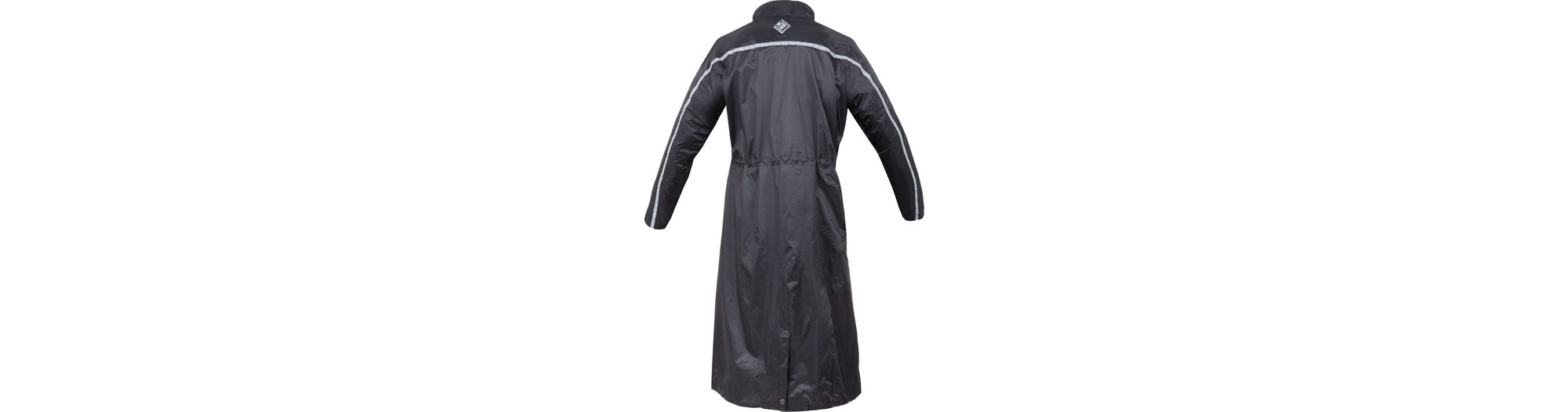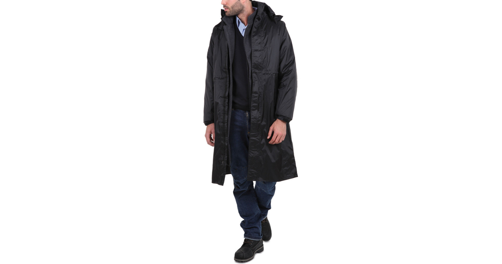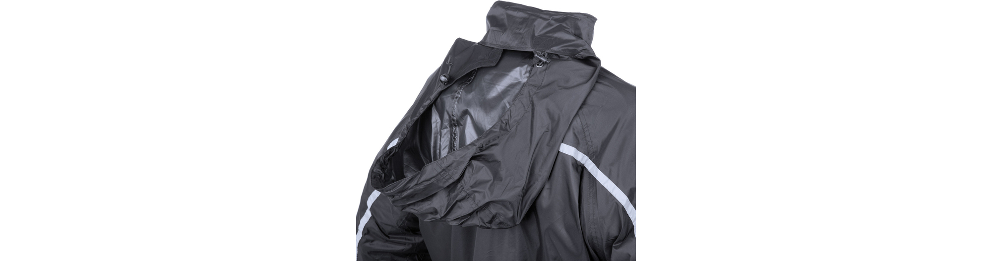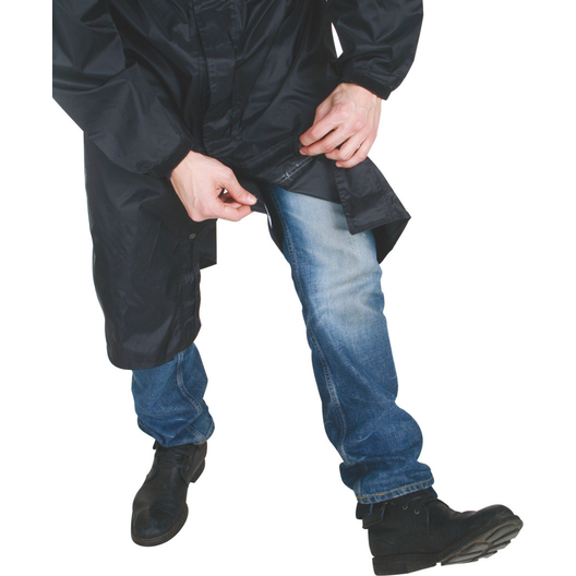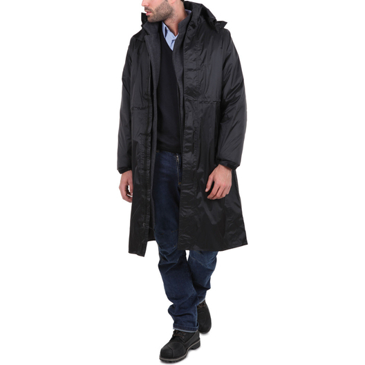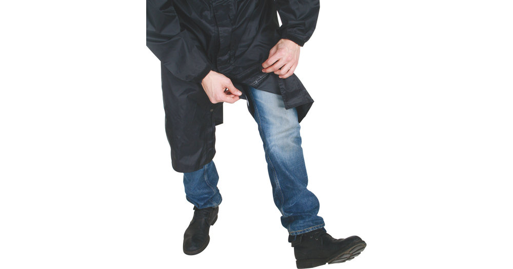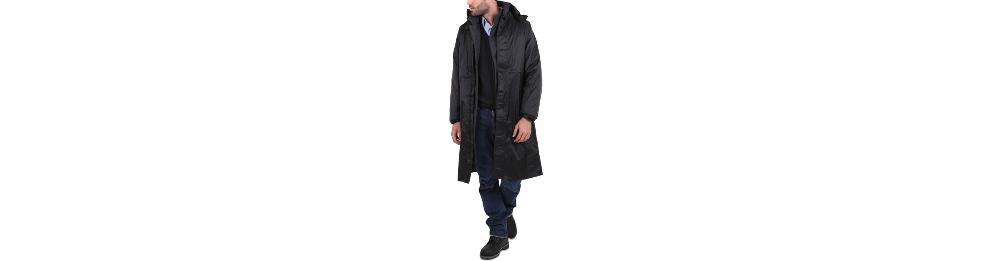 Veste longue pour la pluie Polyamide enduit polyuréthane pour une bonne imperméabilité Coutures soudées Bandes réfléchissantes Capuche à dimension variable repliée dans le col Ouverture…