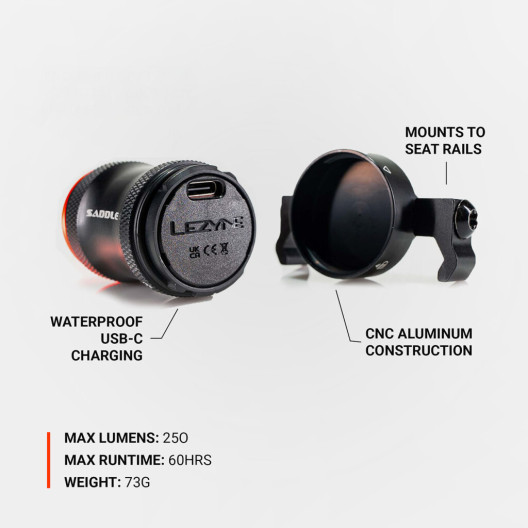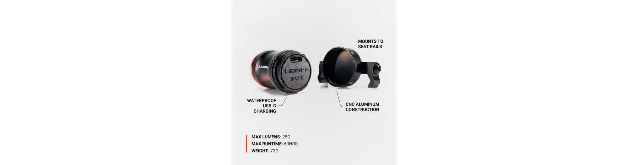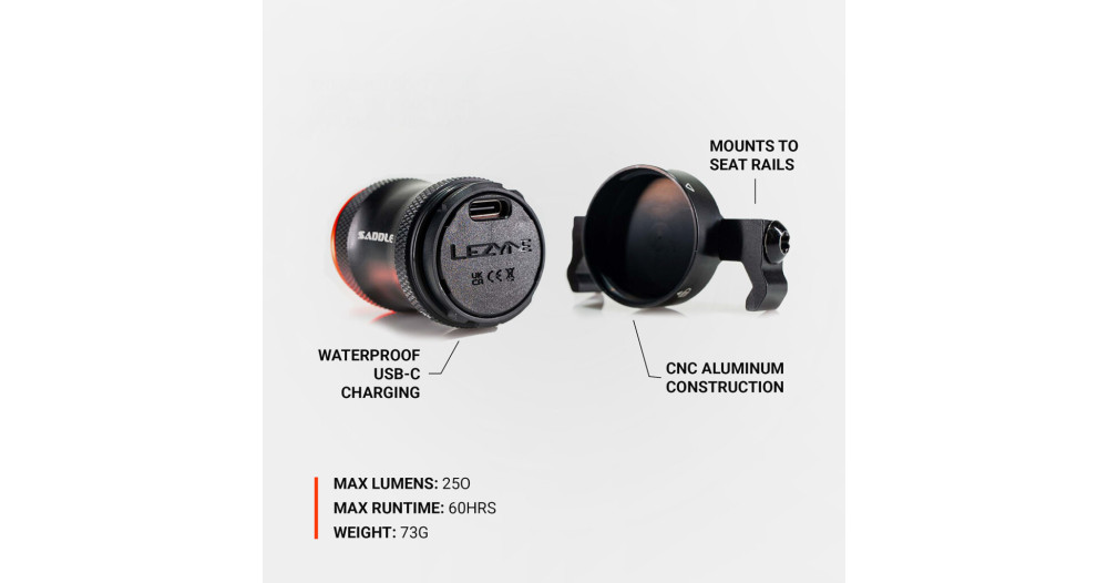 Découvre le feu arrière parfait pour ton vélo de course: le Lezyne Saddle Drive 250 Rear. Ce feu arrière compact et élégant s'intègre de manière presque invisible sous ta selle et s'adapte parfaitement aux cadres de selle modernes grâce à son design intelligent. Idéal pour tous ceux qui attachent de l'importance à un look épuré et à une fonctionnalité maximale - sans support ni câble gênant. Équipé de 10 LED puissantes et d'une optique grand angle pour une visibilité à 270°, le Saddle Drive 250 te permet d'être vu de manière optimale dans toutes les conditions de luminosité, que ce soit à la lumière du jour, au crépuscule ou la nuit. Tu es ainsi en sécurité dans toutes les situations. Tu as le choix entre 7 modes d'éclairage différents, dont le mode Day Flash extrêmement voyant avec jusqu'à 250 lumens, qui te rend visible même en plein soleil, ainsi que le mode FEMTO particulièrement économe en énergie, qui t'offre une autonomie impressionnante allant jusqu'à 60 heures. Tu peux ainsi parfaitement adapter ton éclairage à chaque sortie, qu'elle soit courte ou longue, de jour ou de nuit. Fabriqué en aluminium usiné CNC de haute qualité, le Saddle Drive 250 n'est pas seulement stylé, il est aussi particulièrement robuste et résistant aux intempéries - naturellement certifié IPX7. La pluie ou les éclaboussures ne lui font pas peur. Grâce à la batterie intégrée de 1100 mAh, tu restes longtemps indépendant, et si le temps est venu de le recharger, tu peux le faire facilement via USB-C - rapidement, facilement et partout. Misez sur une sécurité maximale, un design moderne et une technologie intelligente.