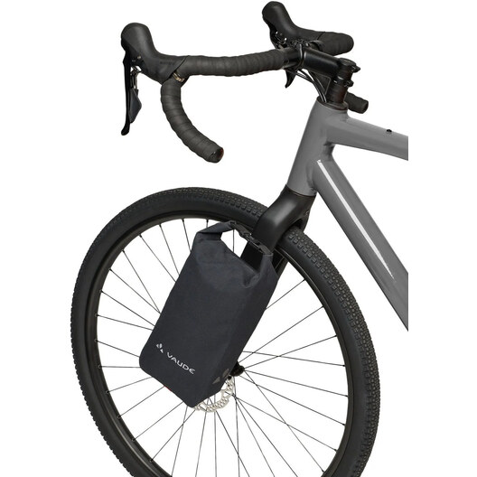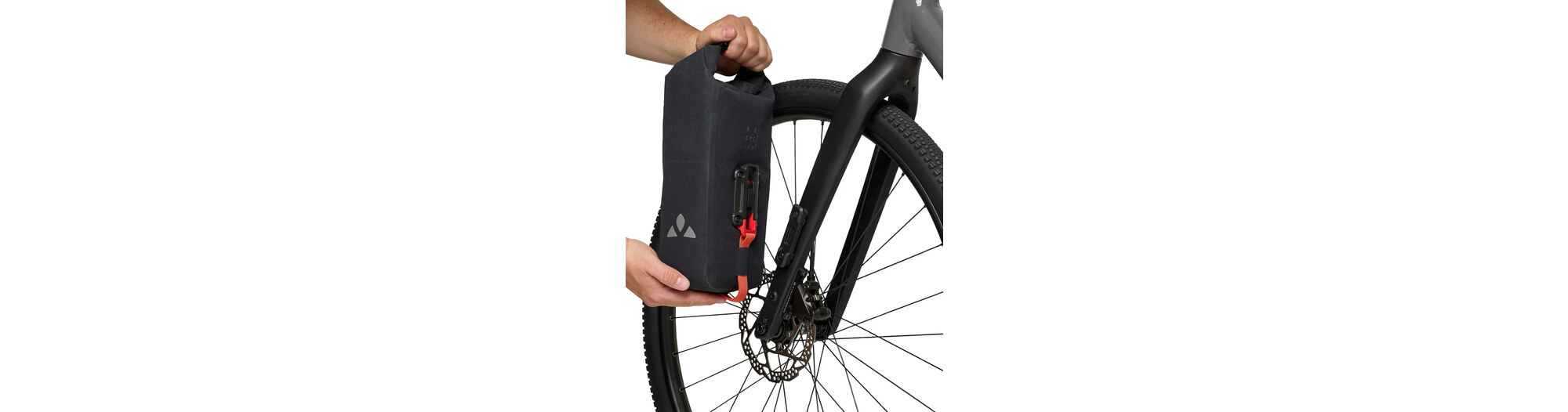 En bikepacking, chaque option de fixation compte. La sacoche de fourche Trailfork, légère et étanche, est l'accessoire idéal pour charger votre vélo au maximum. Elle se fixe grâce à l'adaptateur extra-plat KLICKfix® Duo, qui se fixe à la fourche à l'aide de deux œillets à vis. La sacoche est solidement fixée à l'adaptateur, positionnée près de la fourche et discrètement, ce qui assure une excellente stabilité au vélo, même sur terrain accidenté grâce à son centre de gravité bas. Une simple traction sur la sangle permet de détacher la sacoche, et elle se remet en place tout aussi facilement. Si vous ne disposez que d'un seul œillet de fixation, vous pouvez utiliser la version Unifit de l'adaptateur KLICKfix® (non fournie). La paroi arrière et le fond de la sacoche sont conçus pour être très robustes, et son volume de quatre litres permet de ranger facilement des vêtements, des ustensiles de cuisine ou des pièces de rechange. Une fermeture à enroulement étanche permet de compresser le contenu en toute sécurité.