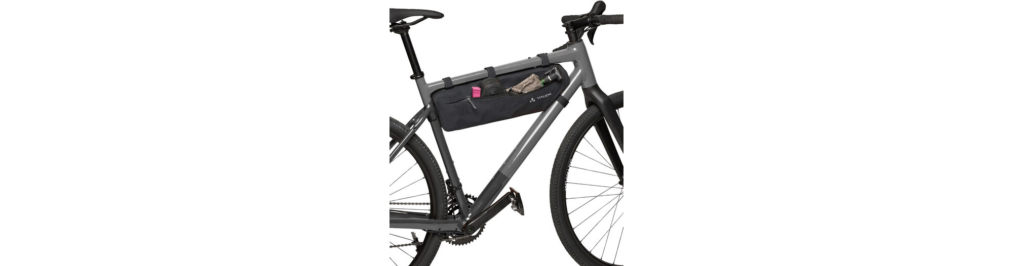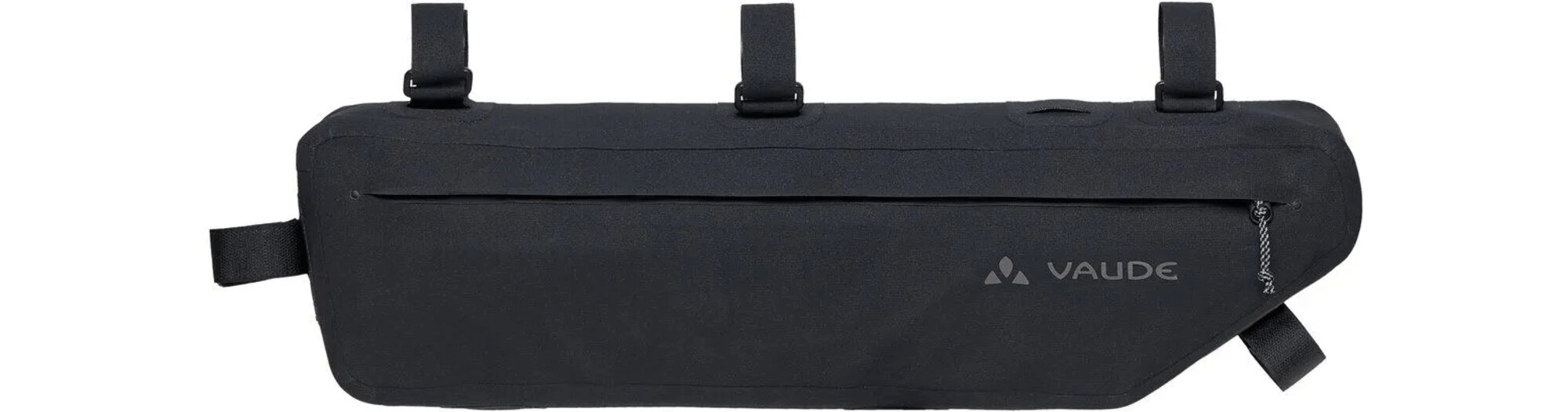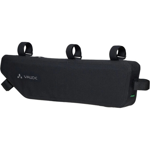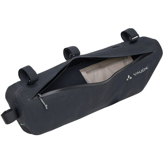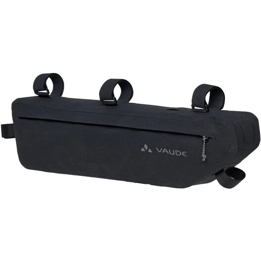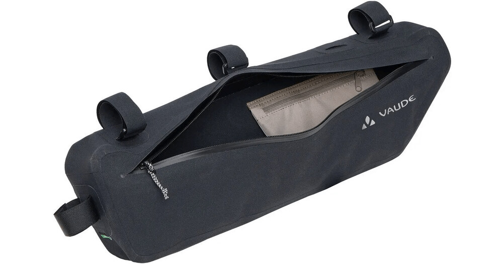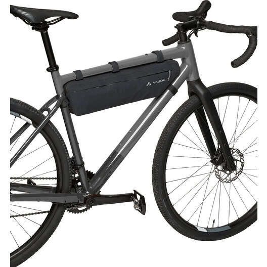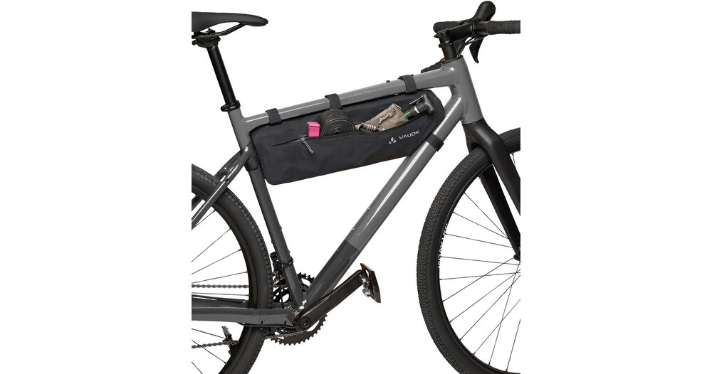 Avec ses cinquante centimètres de long et ses cinq litres de volume, la sacoche de cadre de vélo Trailframe est très généreuse et avale volontiers les bagages les plus lourds et les plus longs - comme les armatures de tente ou les aliments - sans influencer le comportement du vélo. La sacoche thermosoudée et étanche est fixée au tube de direction, au tube supérieur et au tube de selle par de solides bandes velcro. Le design fin offre suffisamment de place pour les genoux, tandis qu'une fixation velcro interne aide à arrimer le contenu pour éviter les soubresauts et à éviter que le sac ne se bombe. L'organiseur zippé dans le compartiment principal sépare les petits objets des bagages plus volumineux. La très longue fermeture éclair principale étanche à l'eau permet de charger et de décharger facilement le sac. Pour une utilisation optimale de l'ensemble du triangle du cadre, la sacoche de vélo Trailframe L (longueur de côté de quatorze centimètres) peut être combinée avec la Trailframe M (longueur de côté de vingt centimètres). Dans le fond de la sacoche se trouvent deux fentes à travers lesquelles les fixations du tube supérieur du Trailframe M peuvent être passées. Cet ensemble de bikepacking remplit, avec son volume total de huit litres, toute la surface entre les tubes du cadre. Veuillez tenir compte des dimensions.